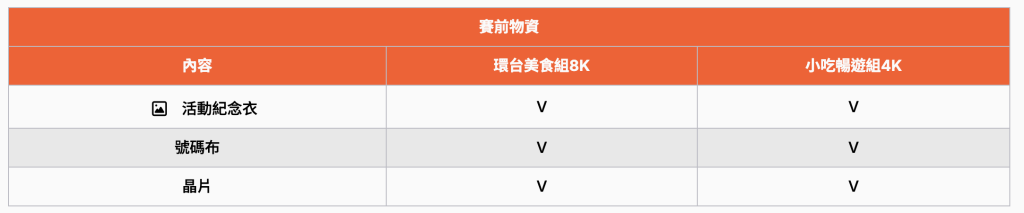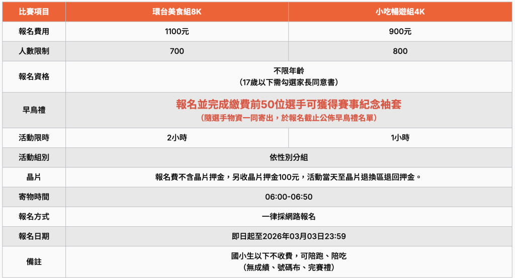 | 備註 | 國小生以下不收費,可陪跑、陪吃 (無成績、號碼布、完賽禮) | |