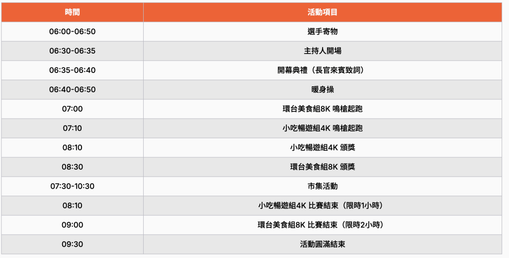 | 09:00 | 環台美食組8K 比賽結束(限時2小時) |