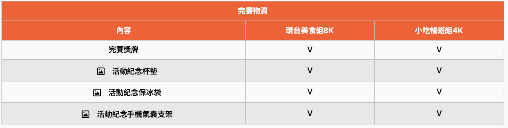 | 比賽項目 | 環台美食組8K | 小吃暢遊組4K |