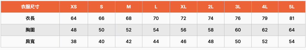 | 衣服尺寸 | XS | S | M | L | XL | 2L | 3L | 4L | 5L |